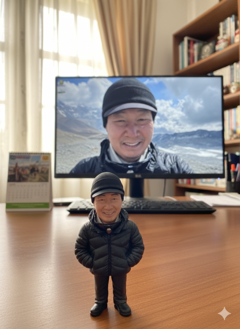 Create a hyper-realistic macro photo of a collectible figure, directly modeled after the person in the reference image. The figure must look identical to the real person in the photo - same face, pose, clothing, and details - without any alterations. Place the figure prominently on a wooden office desk. office desk figure more smaller and 3D.On the desk, there is a computer monitor that clearly displays the exact original reference photo on its screen (not a random image). A calendar is placed next to the monitor. In the background, include a softly blurred bookshelf and a window with curtains. Capture the figure with shallow depth of field, natural soft lighting, and DSLR macro photo style, showing realistic resin texture, painted colors, and fine details such as fabric folds and surface textures.